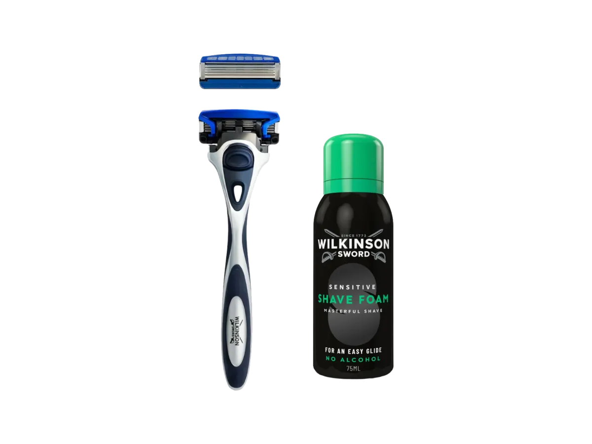 Få komplett startpakke med Hydro 5 barberhøvel, refillblader og Wilkinson Sword barberskum.