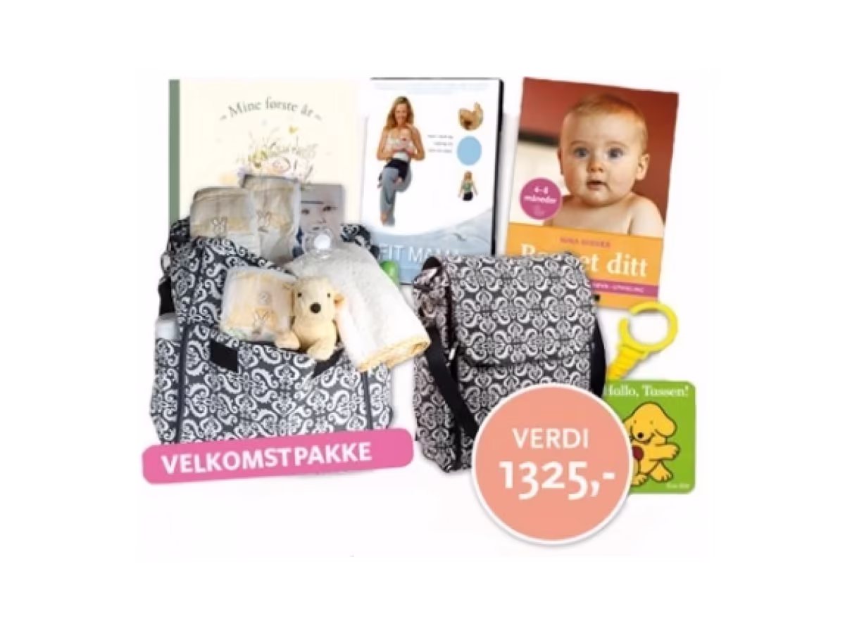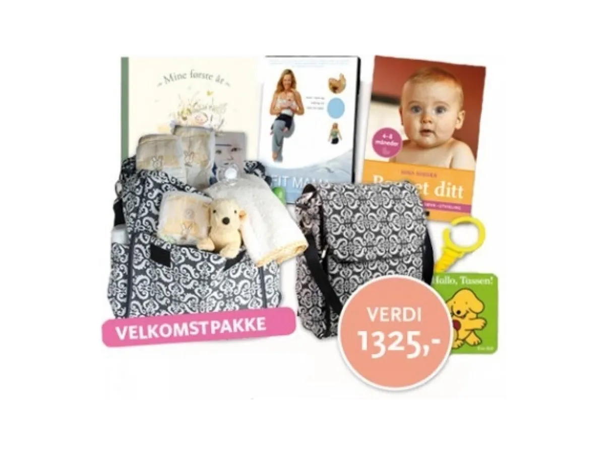 Babyglede gir nå en babypakke med superflott stelleveske, Hallo Tassen, DVD Fit Mama, Mine første år og Barnet ditt 4-8 måneder gratis til nye medlemmer, uten kjøpsforpliktelser.