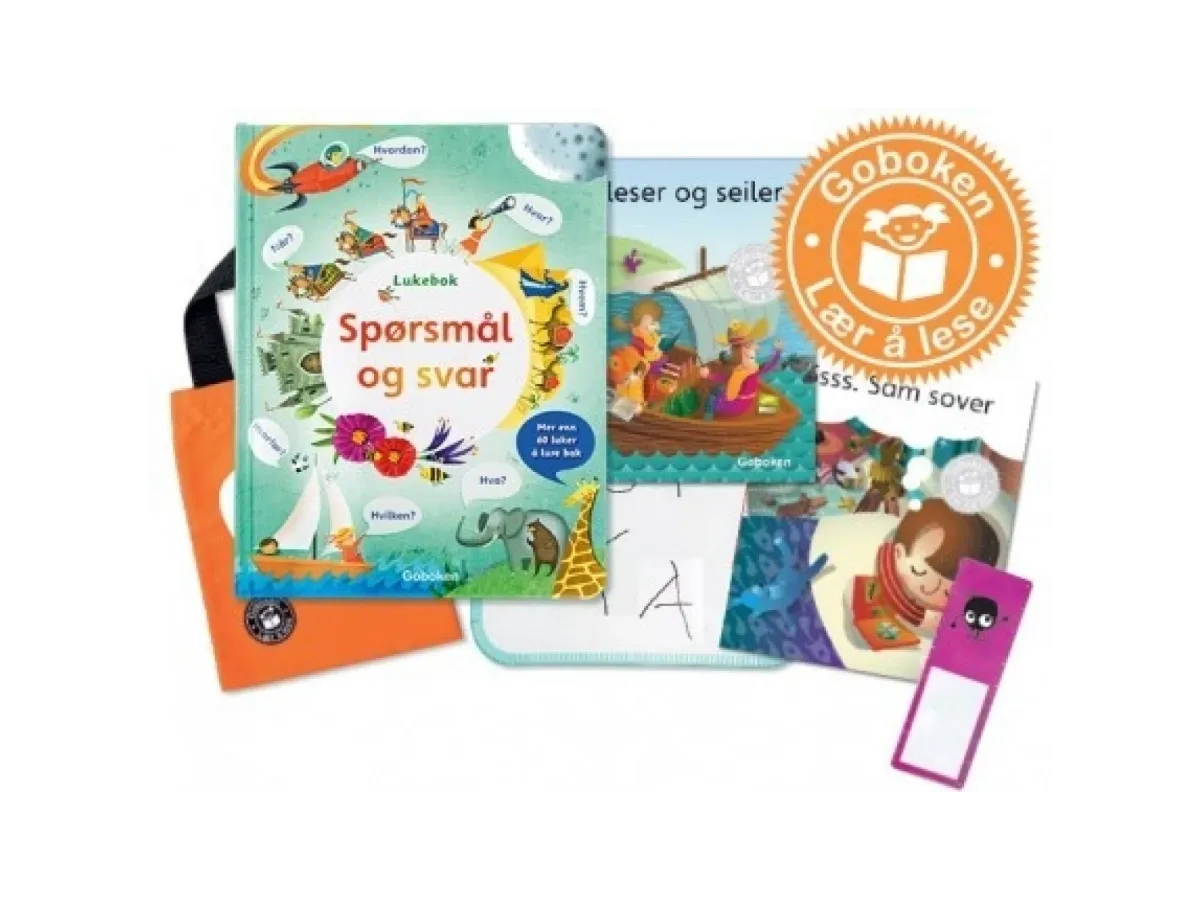 Du får høytlesningsboka "Spørsmål og svar", de to lær-å-lese-bøkene "Vi leser og seiler" og "Ssss. Sam sover", samt e-utgaver av alle bøkene. Du får også en whiteboard med bokstavplansje, et solid boknett og bokmerke med linjal og forstørrelsesglass. I tillegg får du en bok med tips til hvordan dere bruker serien.