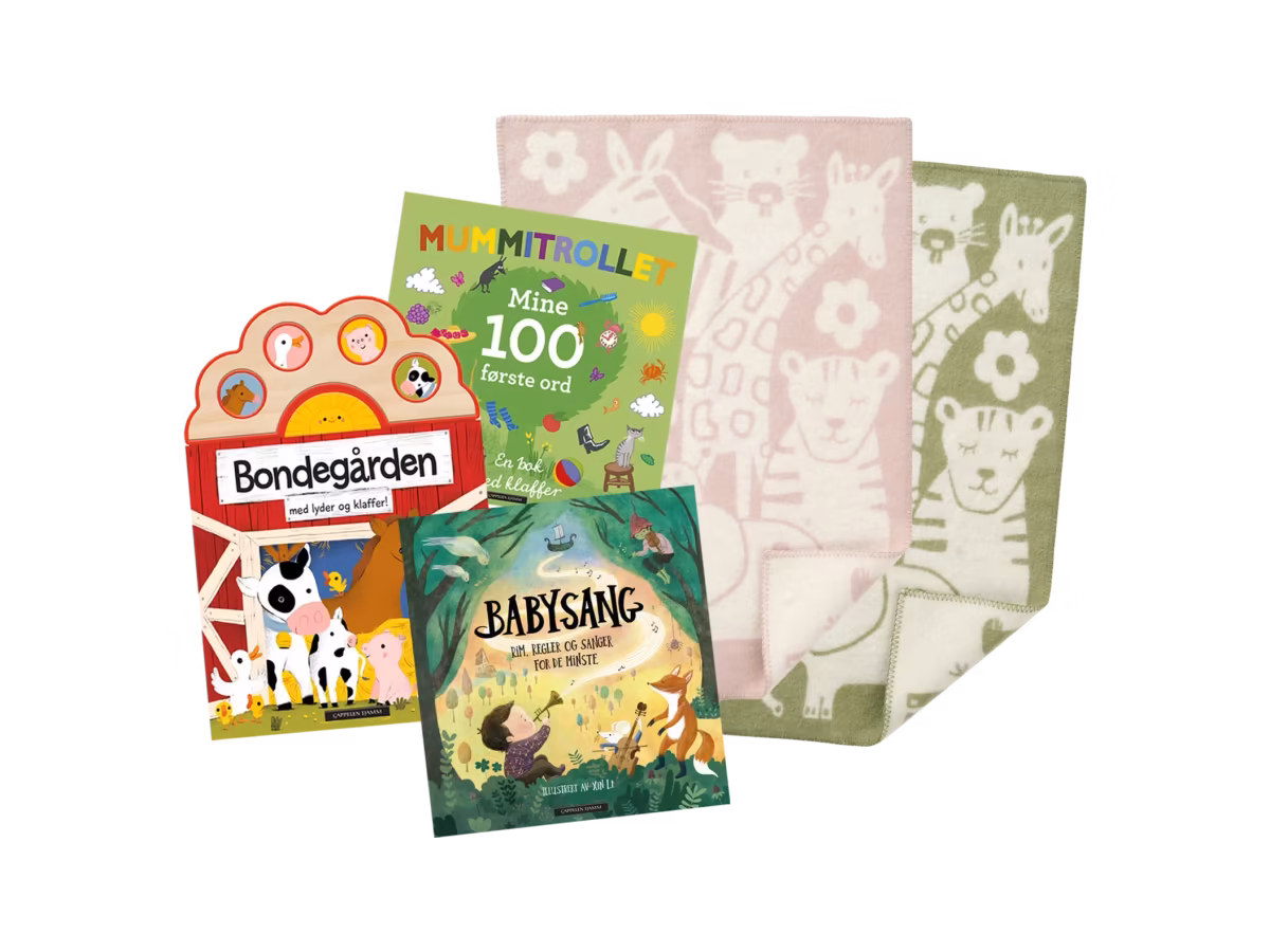 Bli medlem i Barnas Egen Bokverden og få et Klippan babyteppe med søtt dyremønster og 3 flotte babybøker i velkomstgave.