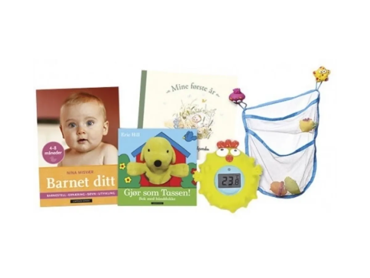 Barnas Egen Bokverden - Baby gir et badetermometer fra Teddykompaniet, badenett, Mine første år - Elsa Beskow minnealbum, solid Tassen pappbok og Barnet ditt 4-8 måneder til nye medlemmer.