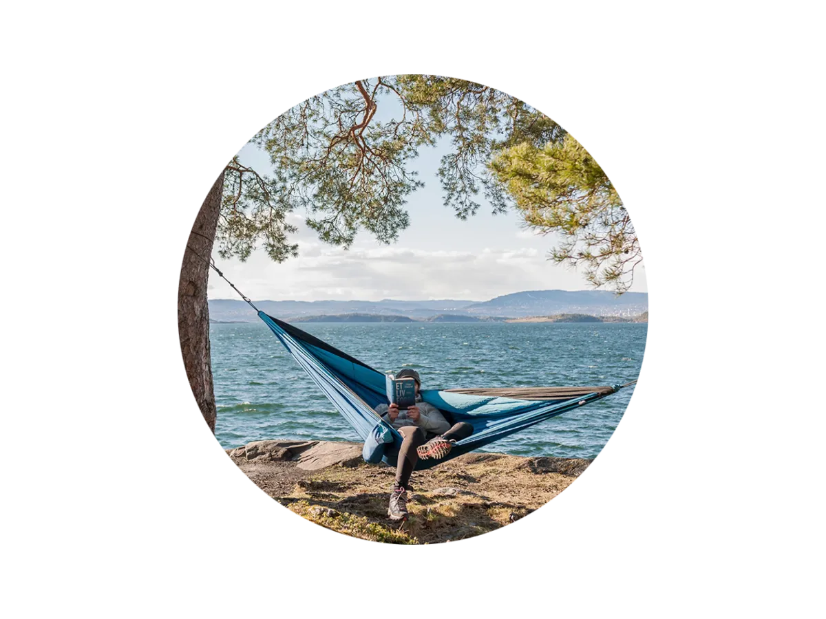 Kroksjøen er en dobbel hengekøye som passer for en, men med plass for to. Enkel å henge opp - praktiske slynger for oppheng følger med.
