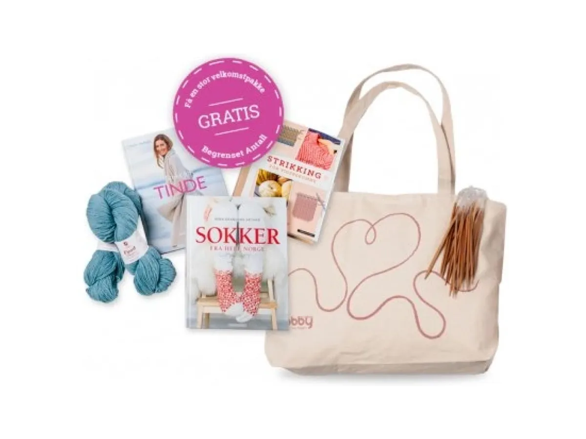 Bli medlem i Hobbyklubben og få en strikkepakke med Bestesokken garnpakke fra Hillesvåg, bomullsnett, rundpinner i bambus og 3 strikkebøker i velkomstgave.