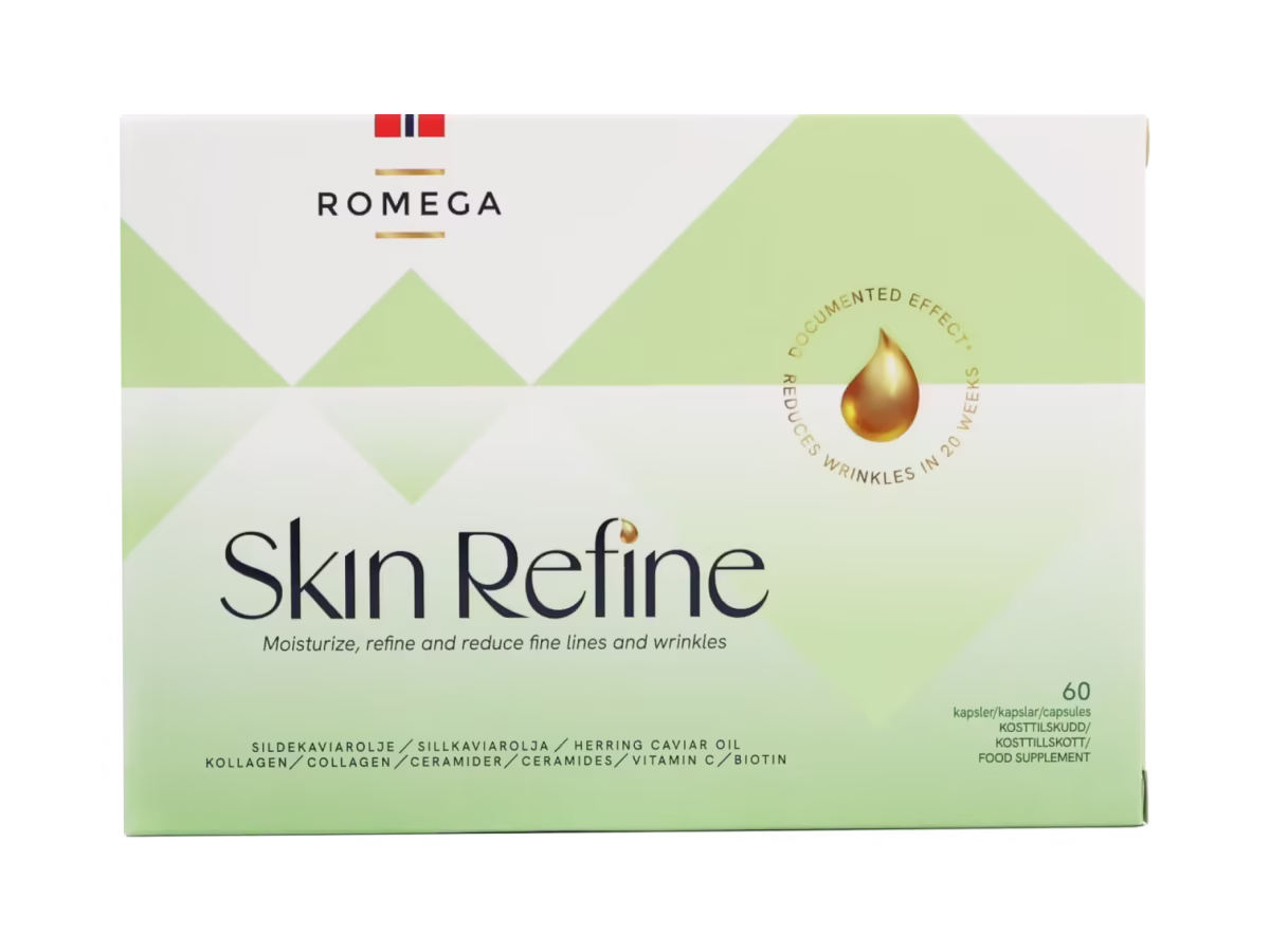 Romega SKIN REFINE er et kosttilskudd med sildekaviarolje, hveteceramider fra Lipowheat®, marint kollagen, vitamin C og biotin.